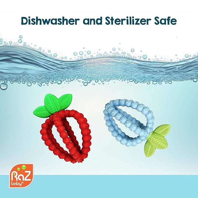 - Easy to Clean: Sterilize our RaZberry teething toys in boiling water for 5 minutes before first use, then rinse in between subsequent uses. Our teethers are durable and they make great baby shower gifts for a boy or girl!