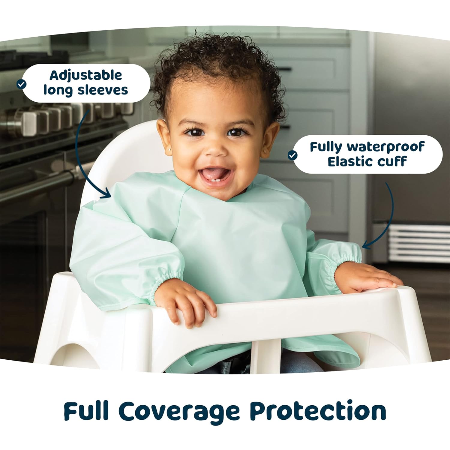 - TRAVEL BUDDY:TRAVEL BUDDY:The must-have baby feeding essentials for on-the-go parents! Our long sleeve waterproof smock bib (fits 6-24 months) is a versatile wipeable bibs with scratch-free closures and 360 degrees puree-proof protection.This bib with sleeves is perfect for plane or car meals, It folds flat in diaper bags,handles baby-led weaning messes and makes a great gender-neutral baby shower gift.Ideal for parents needing baby eating essentials on the go.