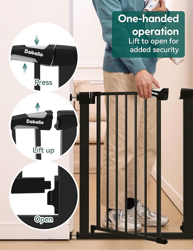 - ONE-HANDED OPERATION: The door lock design of the safety gate is convenient for one-handed operation, and parents can quickly open the walk-through door even when they are hugging their children. Combined with double lock design, adults can easy unlock and lift the baby gate with one hand but it is difficult for babies