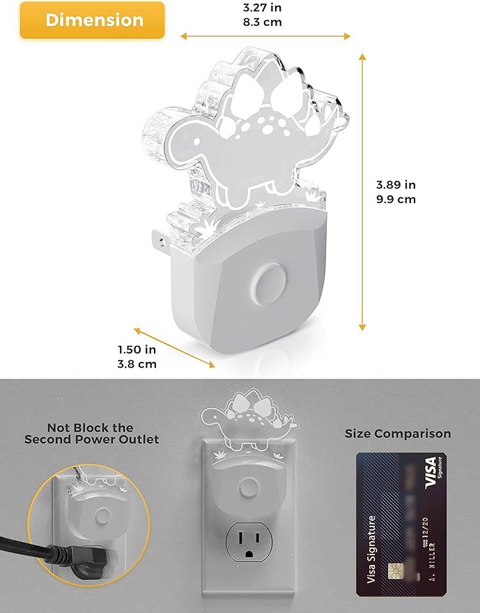 - Dusk to Dawn Sensor: This dinosaur plug in night light has a built-in light sensor. When the surrounding light is dark enough when the night light will open, when the light becomes bright night light will automatically turn off.