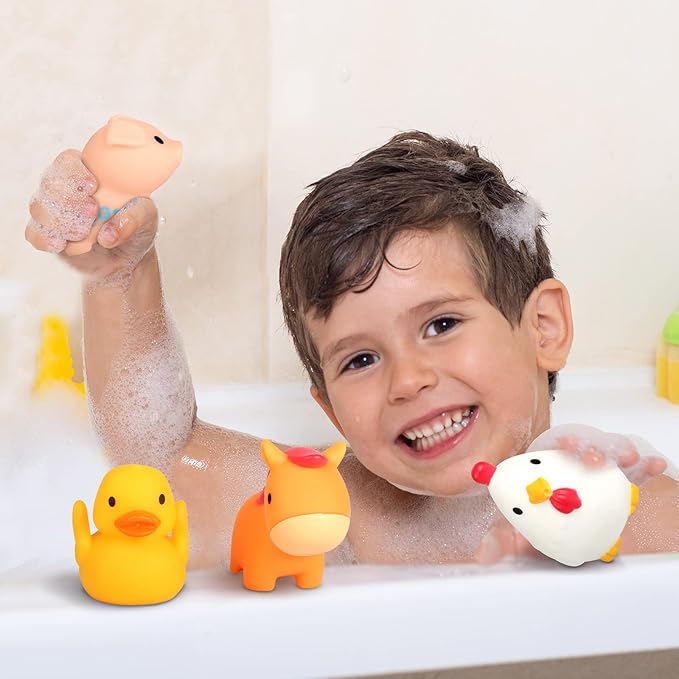 - Farm Animal Bath Toys - We know what parents care about! Safety is the number one priority for bath water toys. Our children bath toys are kids-safe and parent-assured. This 6 farm animal figures bath toys soft and easy to grab. These toddler bath toys are made of soft rubber that kids can chew on (kids chew everything they get!). Smooth surface and suitable size for kid to grab. Bright colors are visually stimulating and spark your little one's imagination. They not only use as kids bath toys, but also can play out of the tub