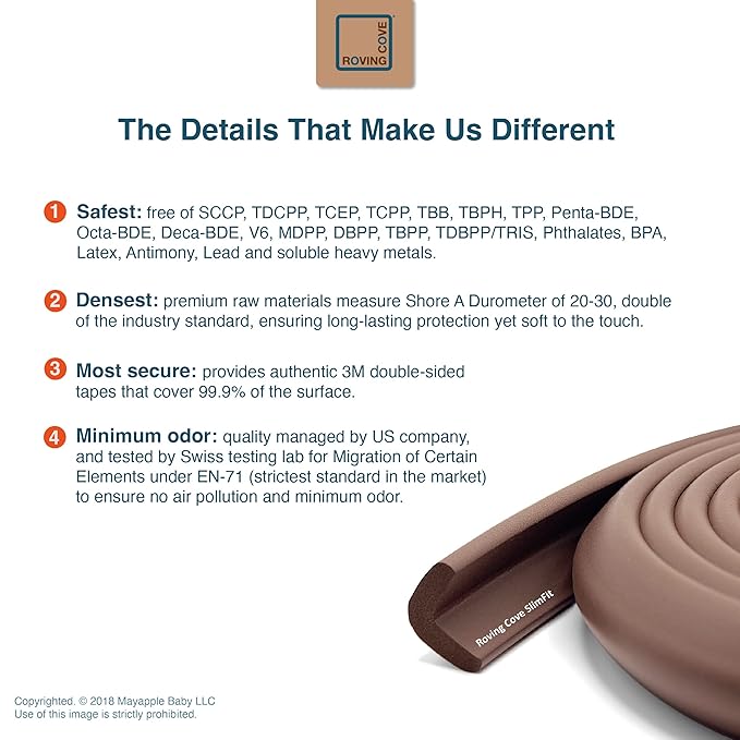 - CLEAN SAFETY: Roving Cove uses safe and pure raw material and was the first brand to make foam safety bumpers without the use of toxic flame-retardant chemicals (SCCPs). Our edge protector cushion contains no BPA, no phthalates, no heavy metals, no latex, no SCCPs. Inherently flame-resistant; passed flammability tests under US regulations.
