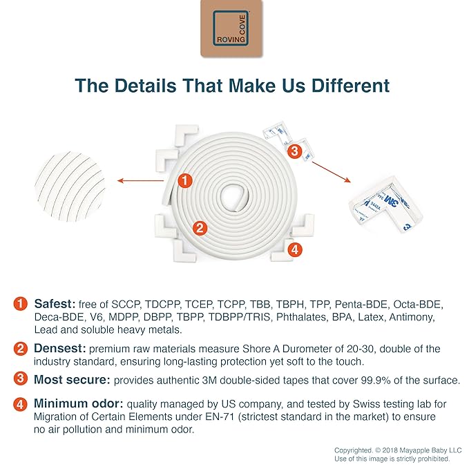 - CLEAN SAFETY: Roving Cove uses safe and pure raw material and was the first brand to make foam safety bumpers without the use of toxic flame-retardant chemicals (SCCPs). Our edge corner guards contain no BPA, no phthalates, no heavy metals, no latex, no SCCPs. Inherently flame-resistant; passed flammability tests under US regulations.