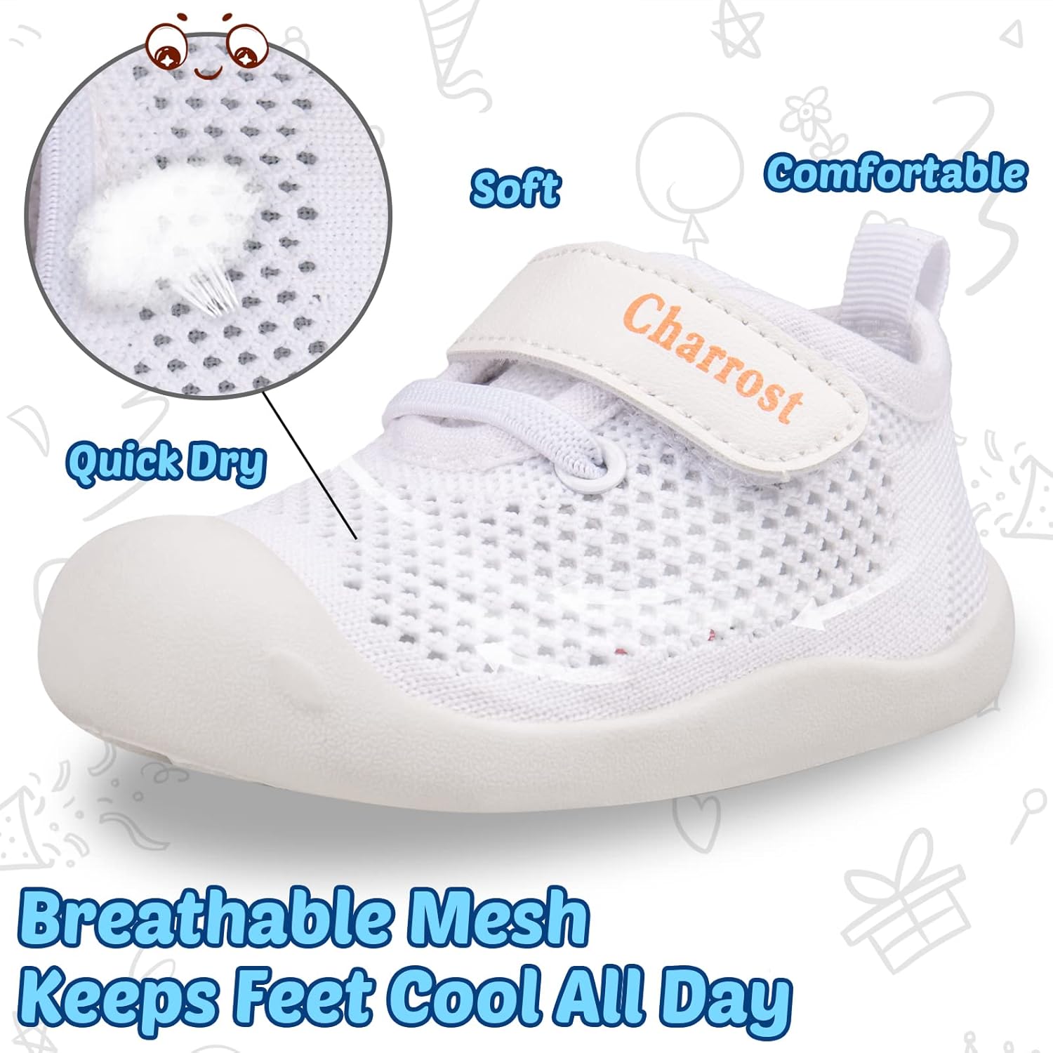 • Breathable&Comfortable: Toddler shoes are made of breathable soft mesh material, which quickly absorbs sweat, allows kid’s little feet to stay cool and dry all day, and is gentle on children skin, making baby's feet feel soft and comfortable even without socks.The mesh surface of toddler running shoes is easy to wash and dry, and if it gets dirty, throw it in the washing machine no problem