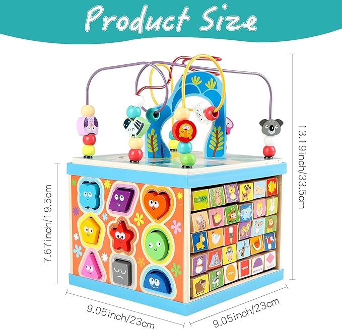 - 5 TOYS IN 1: This activity cube for toddlers combines 5 different activities in 1: bead maze, ABC-123 abacus blocks, spinning gear, shape sorter and learning clock. With this baby development toy, your toddler can keep playing for hours and develop their mind, senses and coordination.
