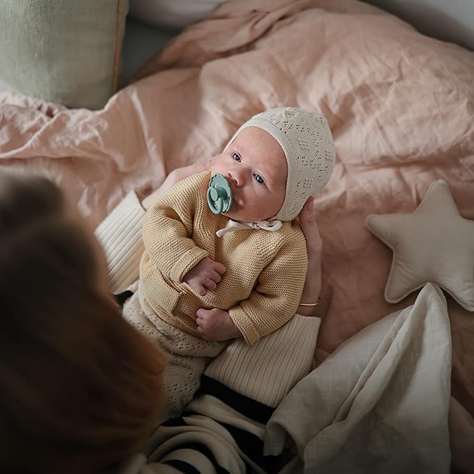 - The FRIGG line of daisy silicone pacifiers with improved SilkySoft nipple and an innovative Click-lock System has been thoughtfully designed for your baby's comfort. The outward curve keeps the pacifier off their delicate skin, while features like air holes and a security handle ensure your baby stays safe. Available in a range of soft colors, FRIGG pacifiers make a beautiful addition to your collection of baby essentials.