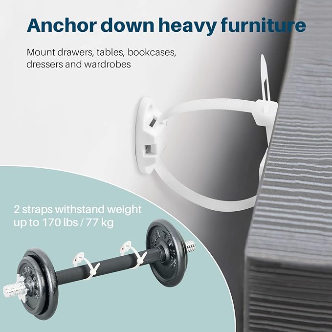 - Heavy Duty Furniture Anchors: Each furniture anchors for baby proofing is designed to support up to 85lbs. With single and dual safety mounting options you can attach furniture with two straps to ensure the complete safety of your child and furnitures