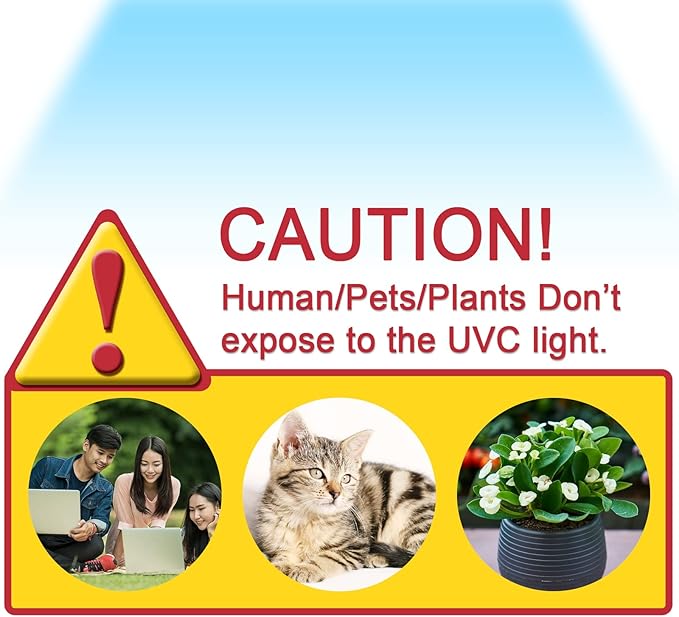 - 【CAUTION!】Human/Pets/Plants can’t be exposed to the UV Light! Must Leave the room when lamp is working.