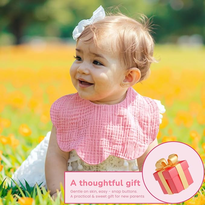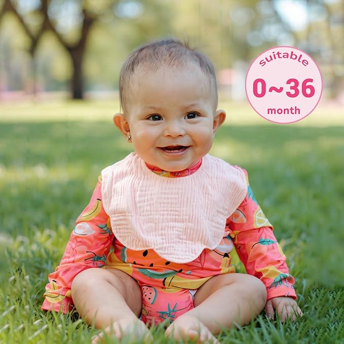 - Super absorbent and breathable bibs : This bib is made of 4 layers of 100% Muslin cotton gauze, which has superb absorbency and breathability. This scientific design helps keep baby's clothes dry and clean throughout the day. Reduce the occurrence of skin-related problems for your baby. Care for your baby's sensitive skin.(Note: Due to the special nature of the material, it is only suitable for air-drying, not for dryers, which may cause the bib to shrink.)