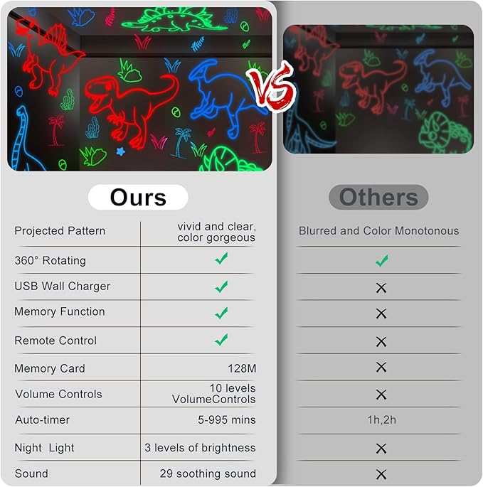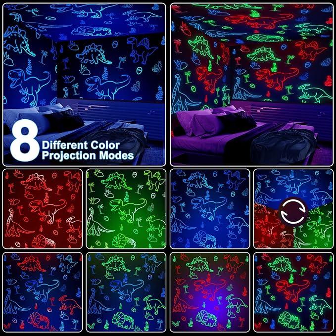 - 【ADDS A VARIETY OF FUN TO YOUR LIVING SPACE】The high-power LED lamp bead projected pattern is more vivid and clear, making the color far more gorgeous.Silent 360-degree rotating design and 8 different color lighting effects. Projects soothing images of dreamy Dinosaur on the ceiling and walls. Let your baby focus on following the spinning Dinosaur pattern to attract your baby's attention, thus calming emotions and relaxation for a quick sleep. No more struggling with bedtime!