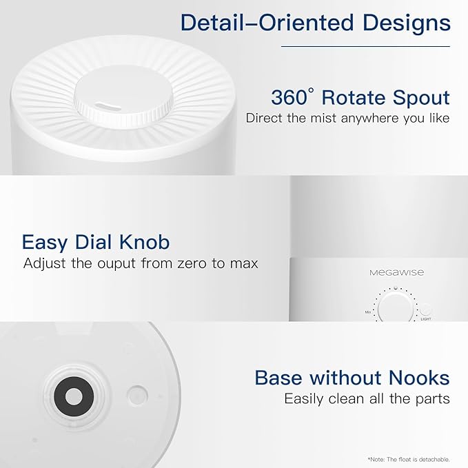 - Adjustable Mist & Whisper-Quiet Operation – Control the mist output with an easy-to-use knob for your preferred humidity level, while the 360° nozzle lets you direct the mist wherever it's needed. Experience peaceful rest with noise levels as low as 24dB, ideal for bedrooms and nurseries. Turn off the light to create a calm, light-free environment for a restful night's sleep.
