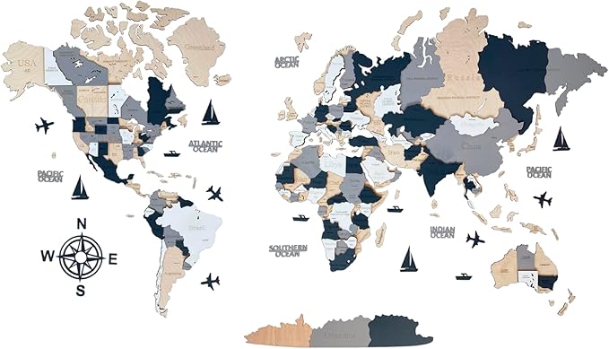 • Create a perfect wall decor with ocean names, wooden airplanes, boats and compass, looking stunning in your bedroom, kitchen or office from our 3d wooden world map!
