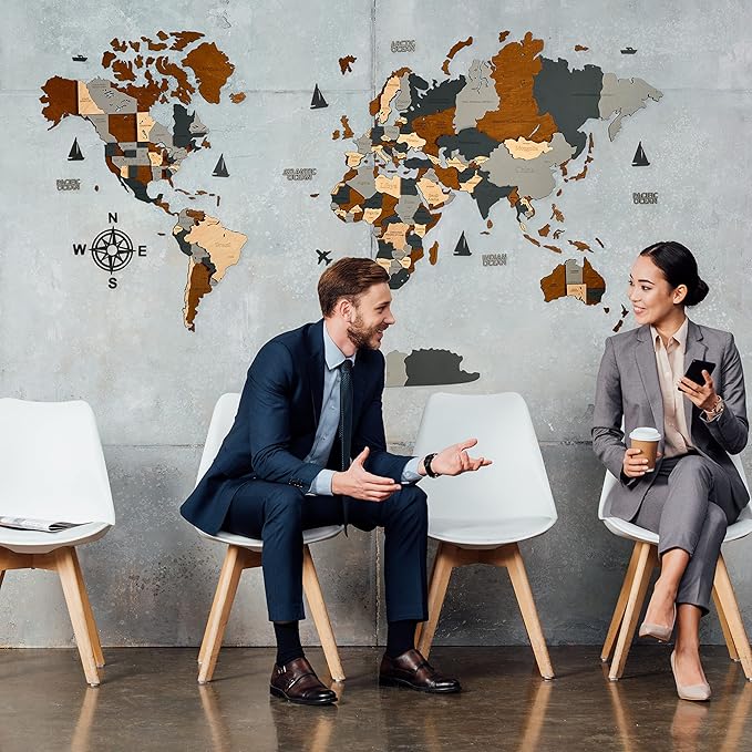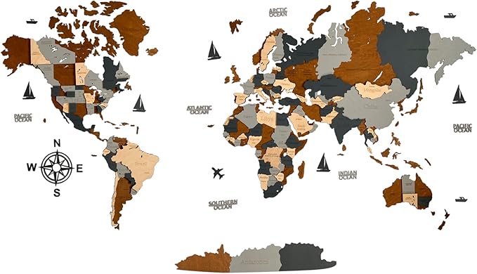 • Create a perfect wall decor with ocean names, wooden airplanes, boats and compass, looking stunning in your bedroom, kitchen or office from our 3d wooden world map!