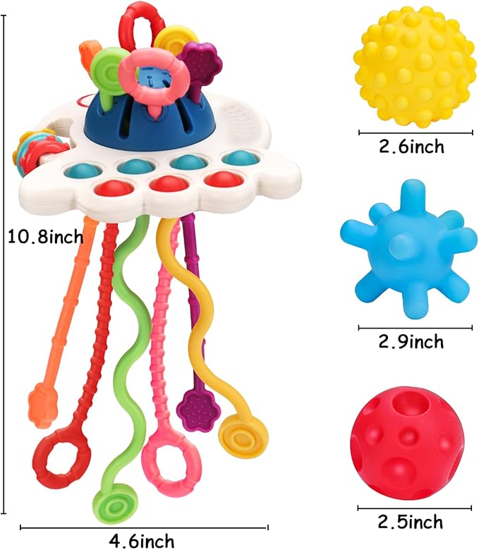 - 【Adorable Octopus-shaped Pull String Toy】Our premium pull string toy comes with 6 texture ropes in different shapes and colors, 1 sliding ball pop it and 7 soft fidgets, help your babies develop finger motor skills, allow them to spend hours in a sensory experience merrily. A perfect solution to catch your babies attention and keep them busy with cute octopus-shaped baby toys.