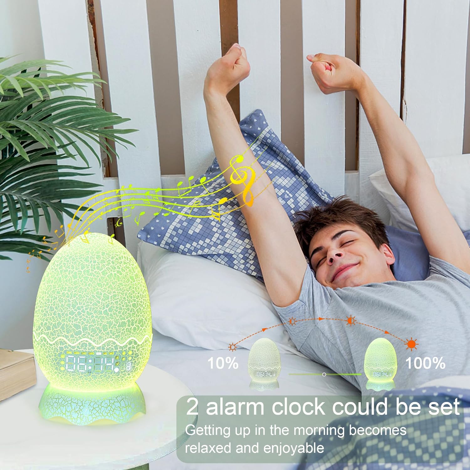 - 【Exquisite Dinosaur Egg Toys】The dinosaur egg is themed around Tyrannosaurus Rex, Integrates night lights, digital clocks, alarm clock, aid sleep white noise. The special spray painting process makes the cracks on the eggshell unique. Open the lid of the egg lamp and you will be pleasantly surprised to find a dinosaur pattern inside. Dinosaur toys giving you and your child a surprising experience illuminating your bedroom or children's room. Supports 12 hour and 24 hour time formats.