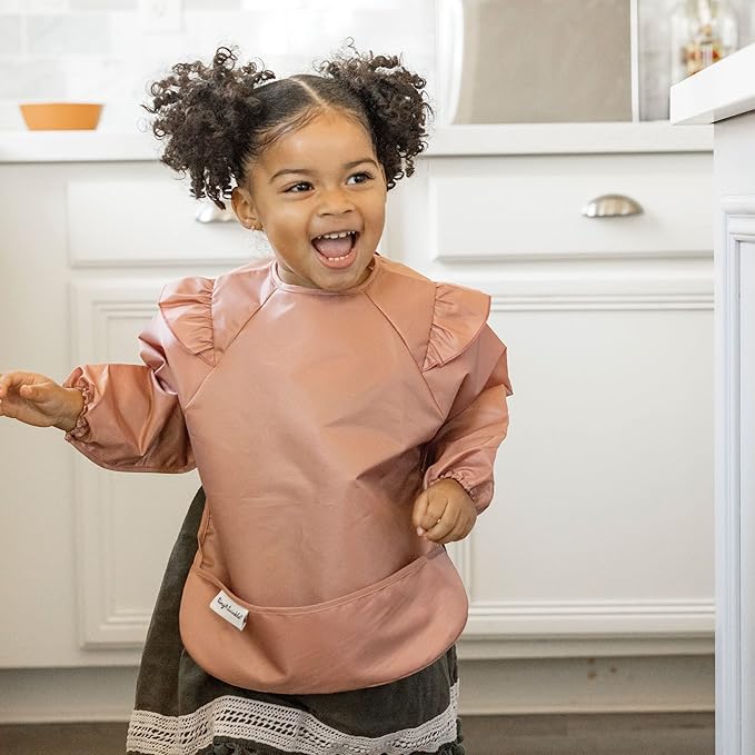 - TRAVEL BUDDY:The must-have baby feeding essentials for on-the-go parents! Our long sleeve waterproof smock bib (fits 6-24 months) is a versatile wipeable bibs with scratch-free closures and 360 degrees puree-proof protection.This bib with sleeves is perfect for plane or car meals, It folds flat in diaper bags,handles baby-led weaning messes and makes a great gender-neutral baby shower gift.Ideal for parents needing baby eating essentials on the go.