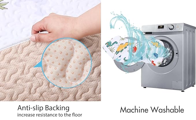 - Non Slip and No Toxic: 50 x 50 play mat for playpen’s surface is made of soft microfiber fabrics, Non-Toxic, no plastic smell, gentle for baby delicate and sensitive skin. Inner layer padded with polyester that is comfortable for babies. Underside of baby playpen mats are anti slip rubbers will stay in place.