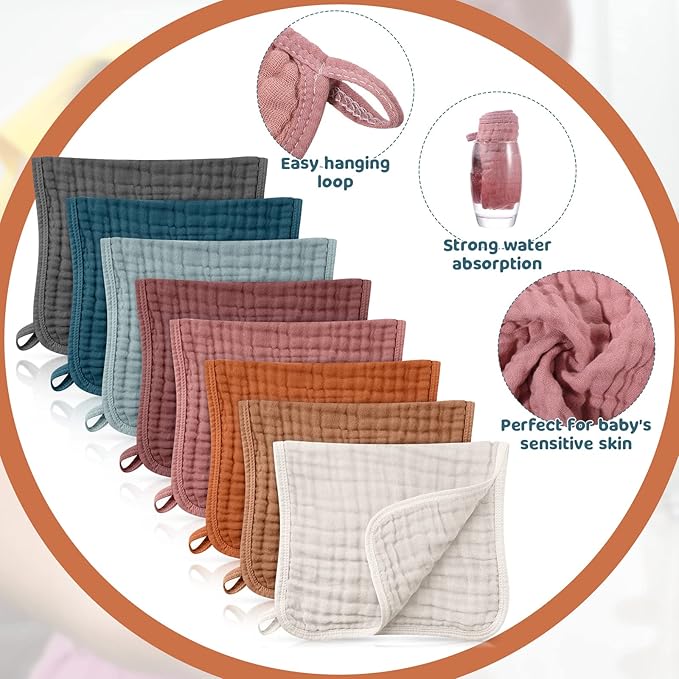 8 Packs Muslin Burp Cloths 6 Layers Unisex Baby Items Absorbent Burp Rags Colorful Muslin Washcloths for Baby Plain Soft Cotton Cloth for Babies Girls Boys, 10 x 20 Inch (Vintage Colors)