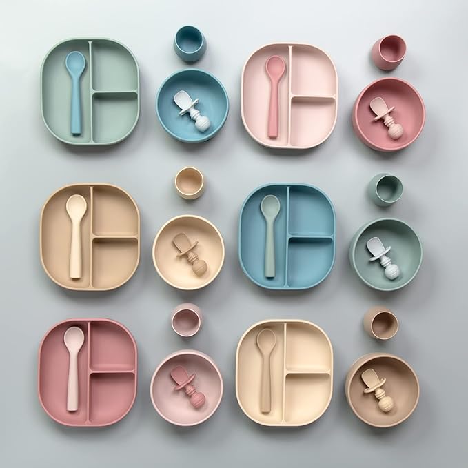SAMiGO Silicone Baby Feeding Set, Baby Led Weaning Supplies, Suction Bowl Plate Bib Cup Self Feeding Spoons, Solid Food Eating Essentials, First Stage Utensils, 6+ Months