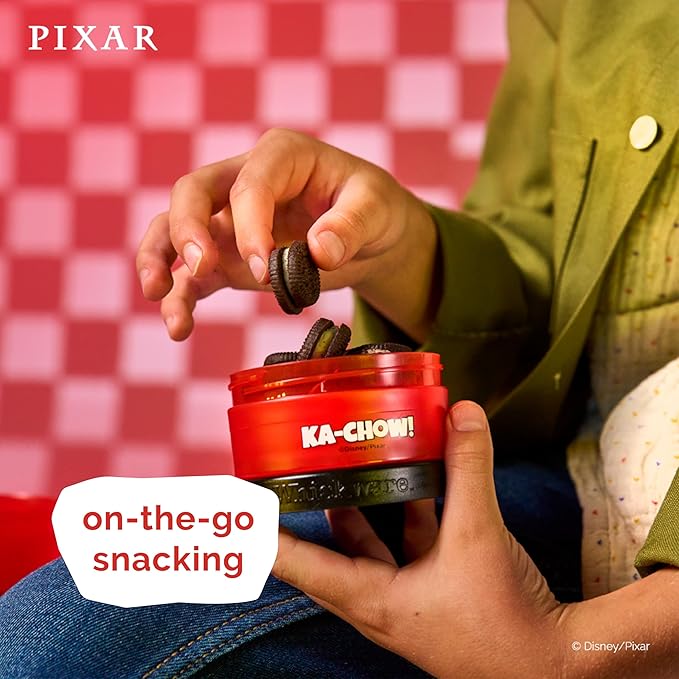 - Stackable, interlocking containers for snacking on the go, featuring officially-licensed Pixar graphics