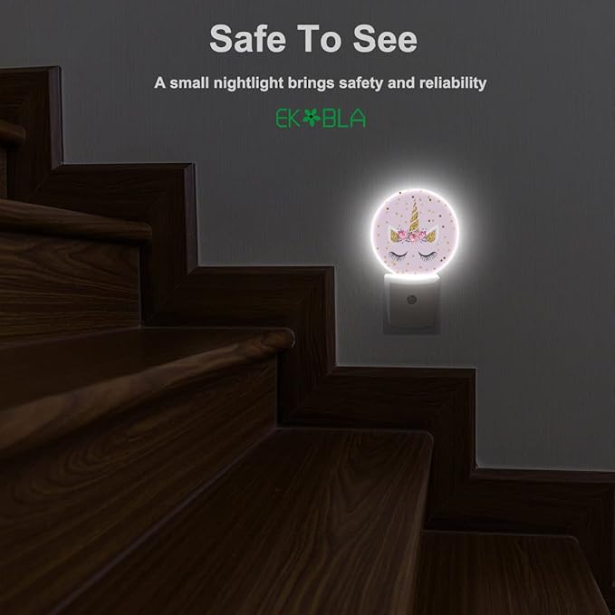 EKOBLA Unicorn Pink Night Light Gold Golden Polk Dots Stars Night Lights Plug into Wall with Dusk to Dawn Sensor Round LED Lamp for Teen Girls Fun Novelty Gift