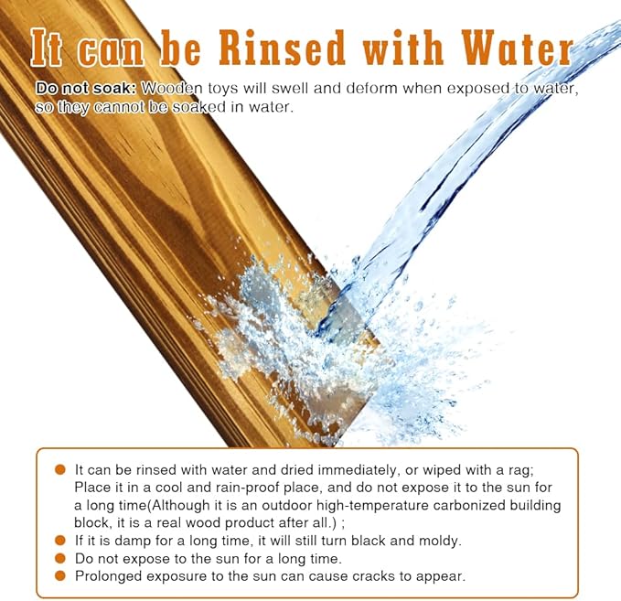- đˇăCARE INSTRUCTIONSăDo not soak:Wooden toys will swell and deform when exposed to water, so they cannot be soaked in water. It can be rinsed with water and dried immediately, or wiped with a rag.Place it in a cool and rain-proof place, Although it is an outdoor high-temperature carbonized building block, it is a real wood product after all. If it is damp for a long time, it will still turn black and moldy. And do not expose to the sun for a long time,can cause cracks to appear.