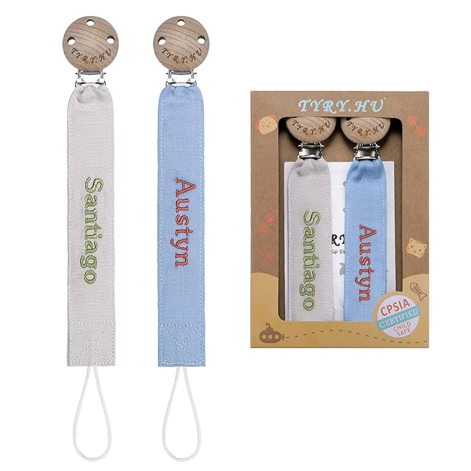 TYRY.HU Personalized Pacifier Clip with Name, Embroidery Webbing Pacifier Holder for Baby Girls and Boys, Neutral Pacifier Leash Universally Fit All Pacifiers & Baby Toys, 2 Pack Baby Gift(Grey, Blue)
