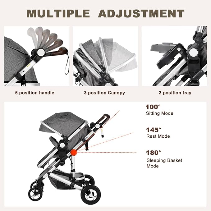 - Give your more choice: Three sitting positions; Three-position canopy; Two-position child tray; Six position canopy; Removable handrail and foot cover; The adjustable front wheels can 360 degrees rotate or keep straight