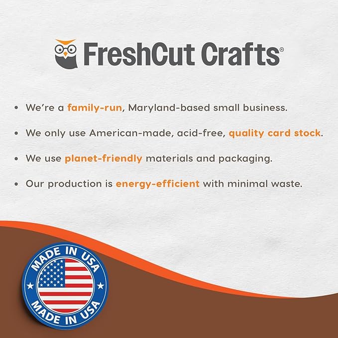 - FEEL-GOOD CRAFTING: At FreshCut Crafts, we're all about crafting with a conscience. Our products are not only about creativity but also about making a positive impact. Proudly family-made in the USA, we use high-quality, acid-free American-made paper that's perfect for preserving memories and creating lasting keepsakes. Our energy-efficient production processes are designed to minimize waste, ensuring that we leave a smaller footprint on the planet.