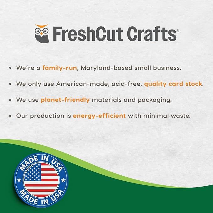 - FEEL-GOOD CRAFTING: At FreshCut Crafts, we're all about crafting with a conscience. Our products are not only about creativity but also about making a positive impact. Proudly family-made in the USA, we use high-quality, acid-free American-made paper that's perfect for preserving memories and creating lasting keepsakes. Our energy-efficient production processes are designed to minimize waste, ensuring that we leave a smaller footprint on the planet.