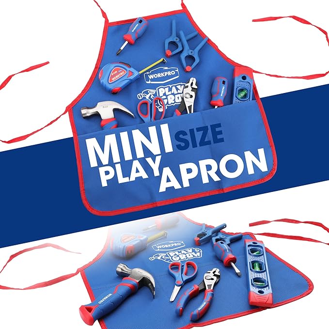 - Fits nicely for small hands with kids-sized stubby tools and a children's size apron to protect their clothes from dust