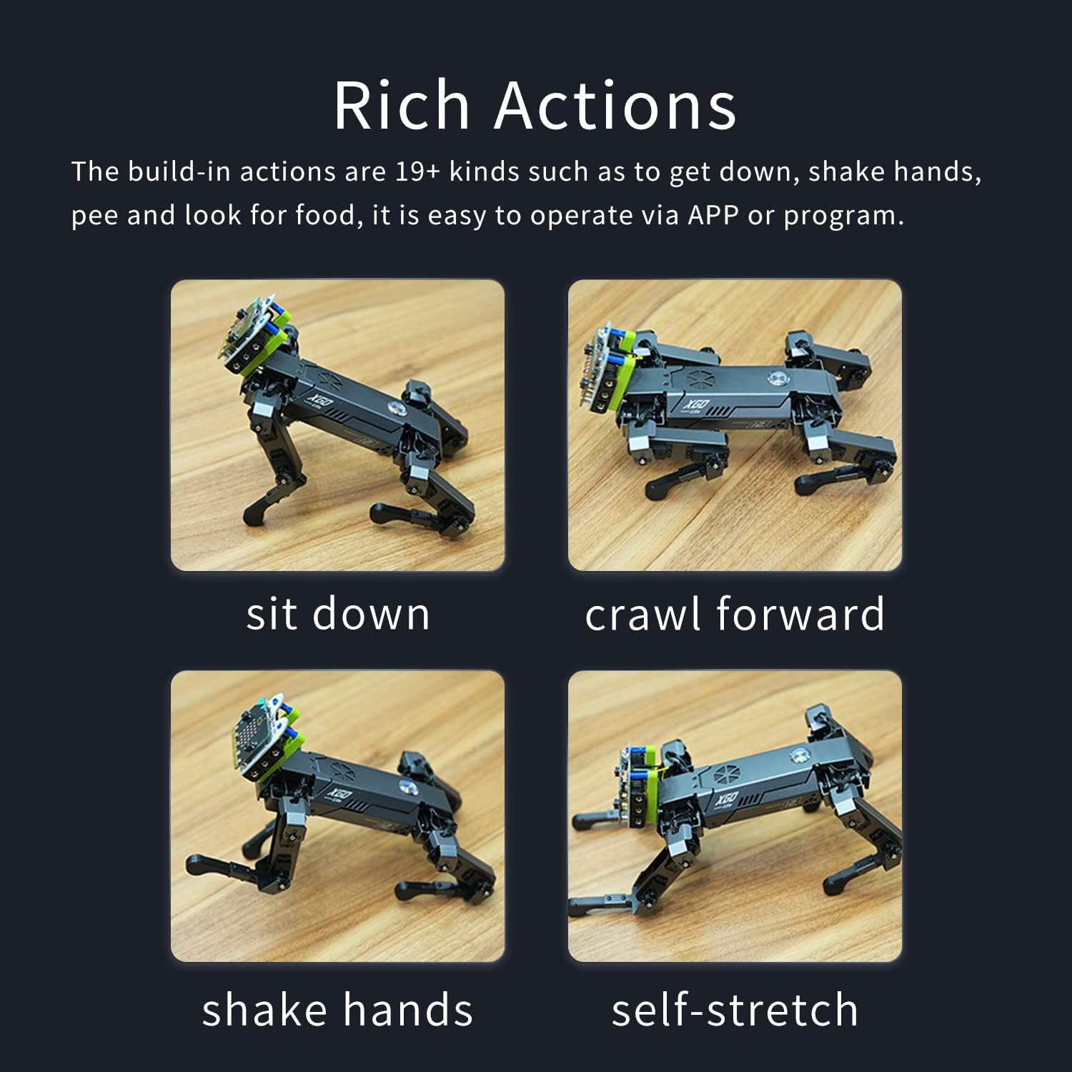 - 【19+ Build-in Actions】 The build-in actions are 19+ kinds such as to get down, shake hands, pee and look for food, it is easy to operate via APP ,or ELECFREAKS joystick and microbit program.