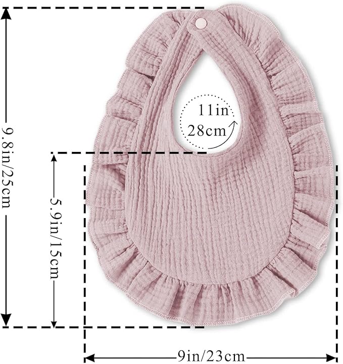- Stylish,scientifically designed bibs:This Muslin bib is designed with buttons for easy wearing and will prevent your baby from dragging. Size of the bib: 9.8inches * 9 inches. Neck diameter of the bib: 11 inches. (Hand-measured) Suitable for babies of different growth periods.Washing instructions: These drooling bibs can be hand washed or gently machine washed, then hang until air dry. (They may shrink in the dryer.) Due to the breathable nature of the material, they will air dry quickly.