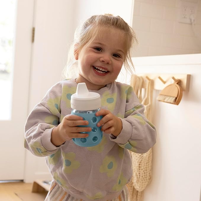 Lifefactory 8-Ounce Wide Neck Glass Baby Bottle with Protective Silicone Sleeve and Hard Sippy Spout, Denim (LG2221WDE4)