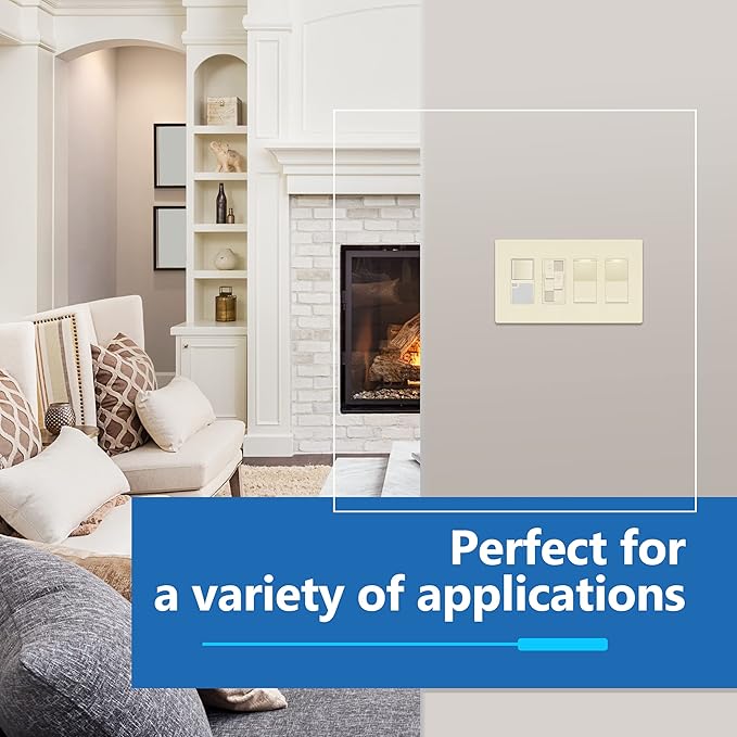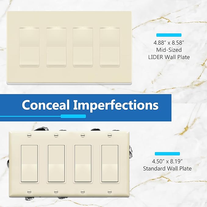 LIDER Matte Finish Decorator Switch Cover, Screwless Wall Plate, Mid-Size 4-Gang 4.88" x 8.58", Unbreakable Polycarbonate Thermoplastic, UL Listed, LSWP-34M-LA, Light Almond