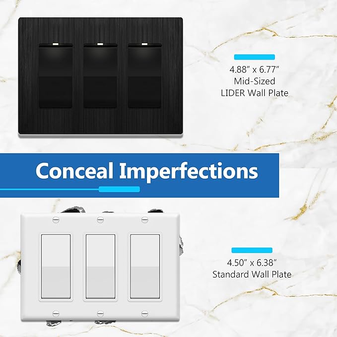 LIDER Brushed Finish Decorator Switch Cover, Screwless Wall Plate, Mid-Size 3-Gang 4.88" x 6.77", Unbreakable Polycarbonate Thermoplastic, UL Listed, LSWP-33M-BBK, Brushed Black