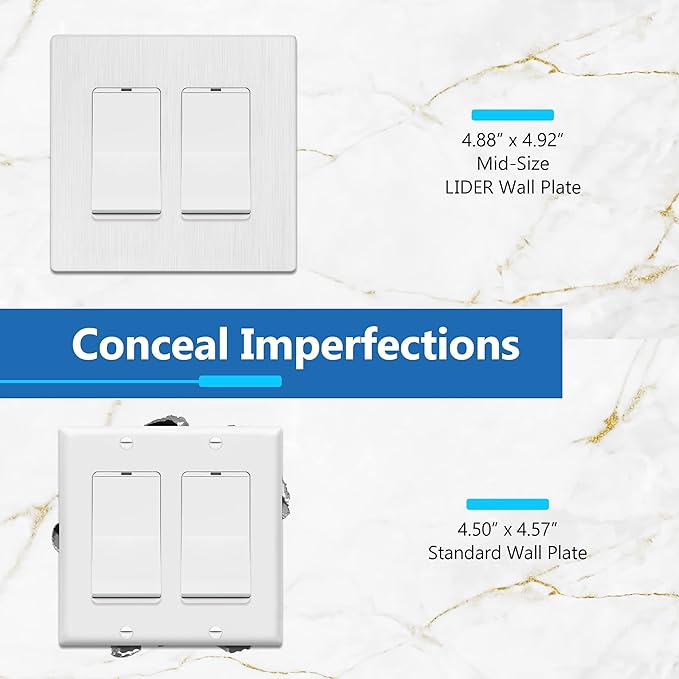 LIDER Brushed Finish Decorator Switch Cover, Screwless Wall Plate, Mid-Size 2-Gang 4.88" x 4.92", Unbreakable Polycarbonate Thermoplastic, UL Listed, LSWP-32M-BW, Brushed White