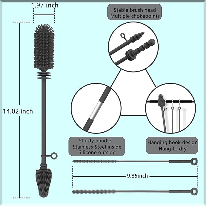 - đźăAll-round cleaning & Easy to use ăthe flexible silicone brush can perfectly achieve 360 degree cleaning,the bristles will not fall off and wear small,and will not scratch the items being cleaned,the non-slip handle is sturdy and comfortable to the touch,stable and firm when cleaning, the large double-headed brush bristle can clean the nipple and bottle,and the 2 small bottle brushes can clean the inside of narrow spaces