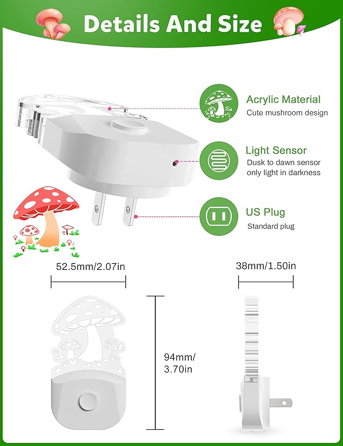 - MUSHROOM NIGHTLIGHTS WITH LIGHT SENSORS: The LED night light has a built-in light sensor that turns the night light on at dusk and off at dawn, providing light only when necessary and saving you energy costs