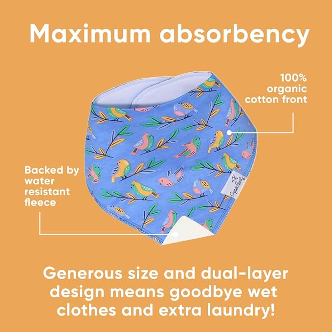 - MAXIMUM ABSORPTION: Fronted by ultra-soft Organic Cotton and lined with water-resistant polyester fleece to provide an extra layer of absorbency. Each bib is crafted with dual-layer protection against heavy drooling or spit-up, keeping your baby dry and comfortable.