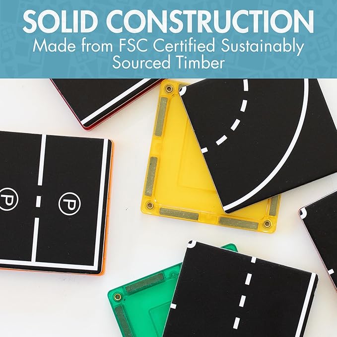 - Securely Attached: Our award-winning road toppers stay firmly in place on any standard magnetic tiles. When it’s time to tidy up or build again, they slide off easily and can be reconfigured into an all-new magnet tile road, city or race track