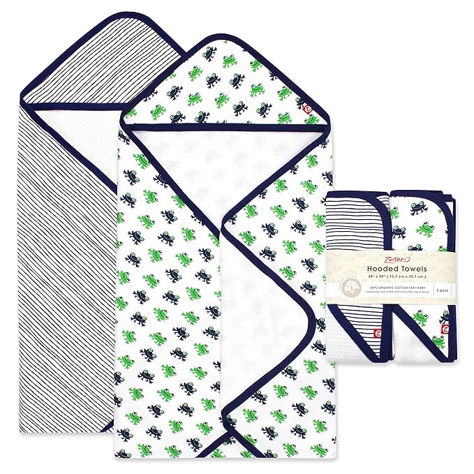 Zutano Hooded Baby Towels, Organic Cotton Baby Bath Towel, Ultra Soft and Absorbent Baby Towel for Newborn and Infant | Girl, Boy, and Unisex Towel Set, Leap Frog, 2-Pack