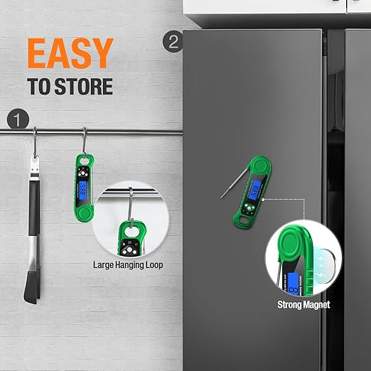 - EASY TO USE: The ultra-thin anti-slip grip design makes this digital grill thermometer easy to maneuver. With its retractable probe, large hang loop and built-in strong magnetic at the back, you can conveniently store the cooking thermometer in the kitchen.