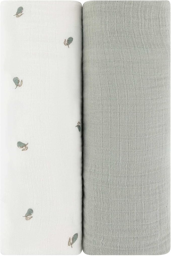 Ely's & Co. Muslin Swaddle Blanket 2-Pack — 100% Cotton Muslin Extra-Large Swaddle Blankets (47” x 47”) Solid + Printed (Sage Pear)