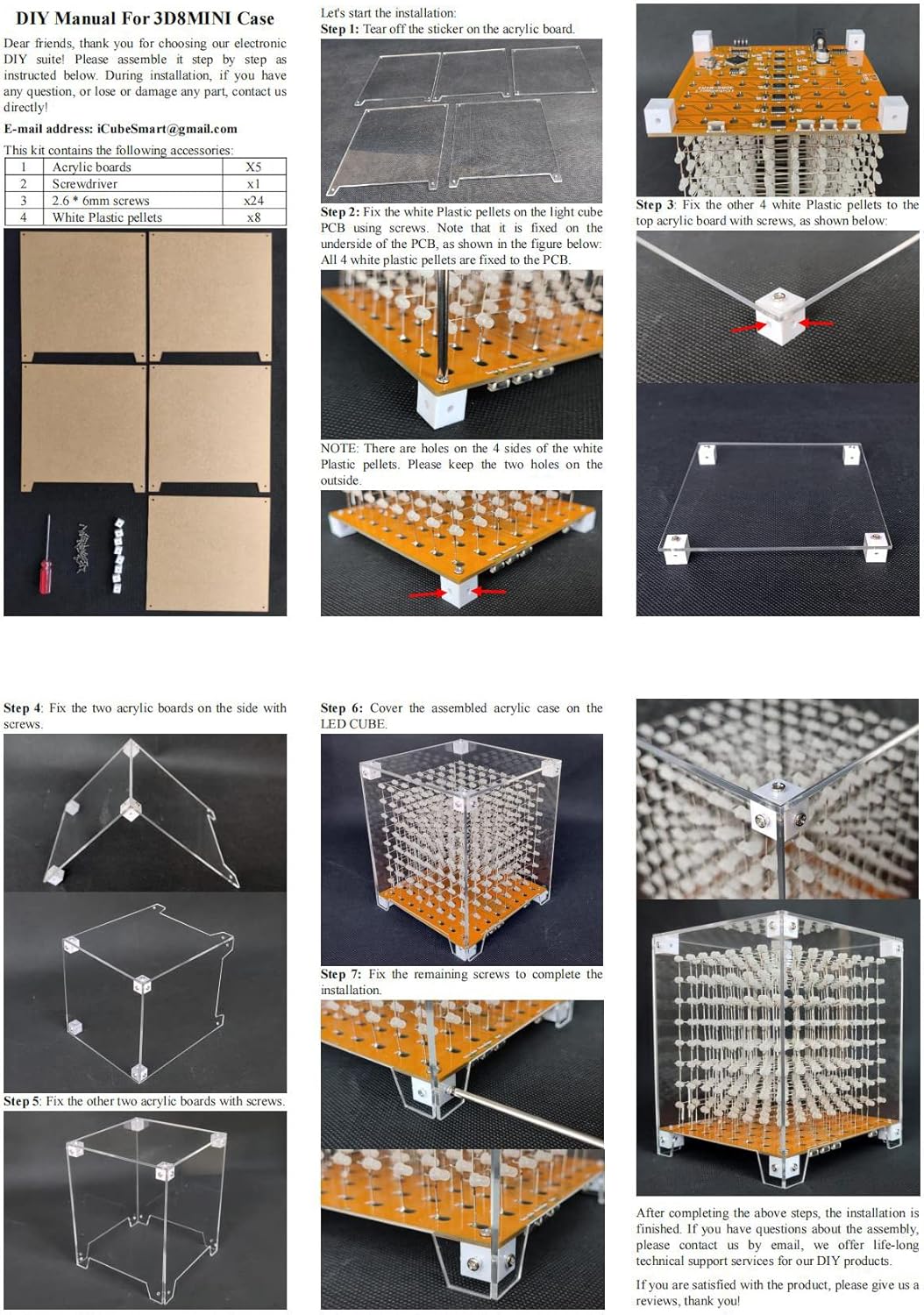 - [Difference between 3D8MINI and 3D8S] The distance between LEDs and LEDs of 3D8MINI is 1.3cm, and the finished product size is 11x11x12cm. The LED-to-LED spacing of 3D8S is 2.3cm, and the finished product size is 18x18.5x19cm.