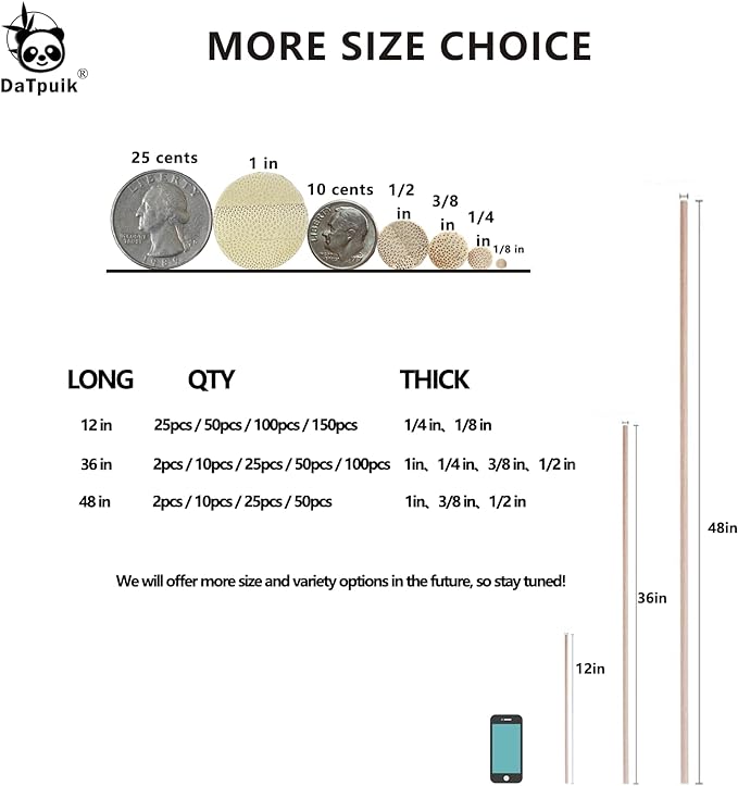 - 1. Size: bamboo dowel rods long 36inch, diameter 1/2inch. Package Includes: 50Pcs bamboo dowel rods.