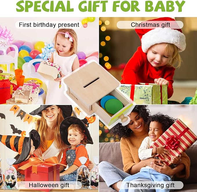 - đăPerfect for Montessori Educationă:This coin box is ideal for Montessori methods, helping toddlers understand placing objects in designated slots, develop color and shape sorting skills, and enhance attention and grip through play.