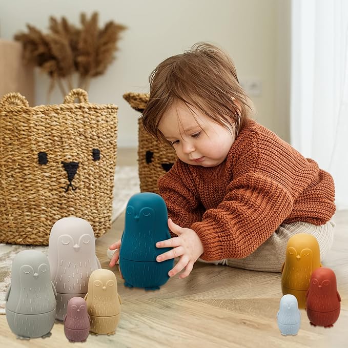 Chivao 8 Pieces Russian Nesting Dolls Silicone Matryoshka Doll Educational Stacking Nesting Dolls for Toddlers Vivid Food Grade Baby Teether for Kids, Gift for Kids(Penguin)