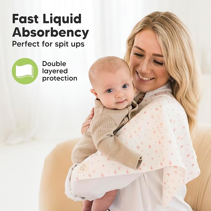 - Super Absorbent, Catches Liquid Well - These burping cloths for babies sits on your shoulder comfortably, and the thick organic cotton catches rolling liquid and spit ups well.