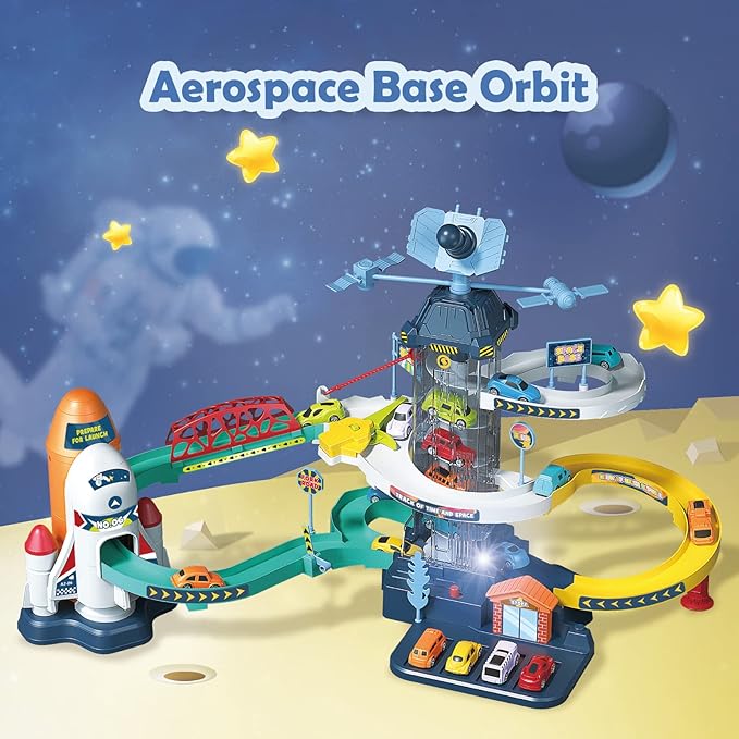 - The design of multiple curves tracks and realistic space tracks,experience the thrill of racing.This elevator track with spacecraft,space station,Satellite design,the spacecraft can rotate 360 °,let your children exploring the mysteries of space.